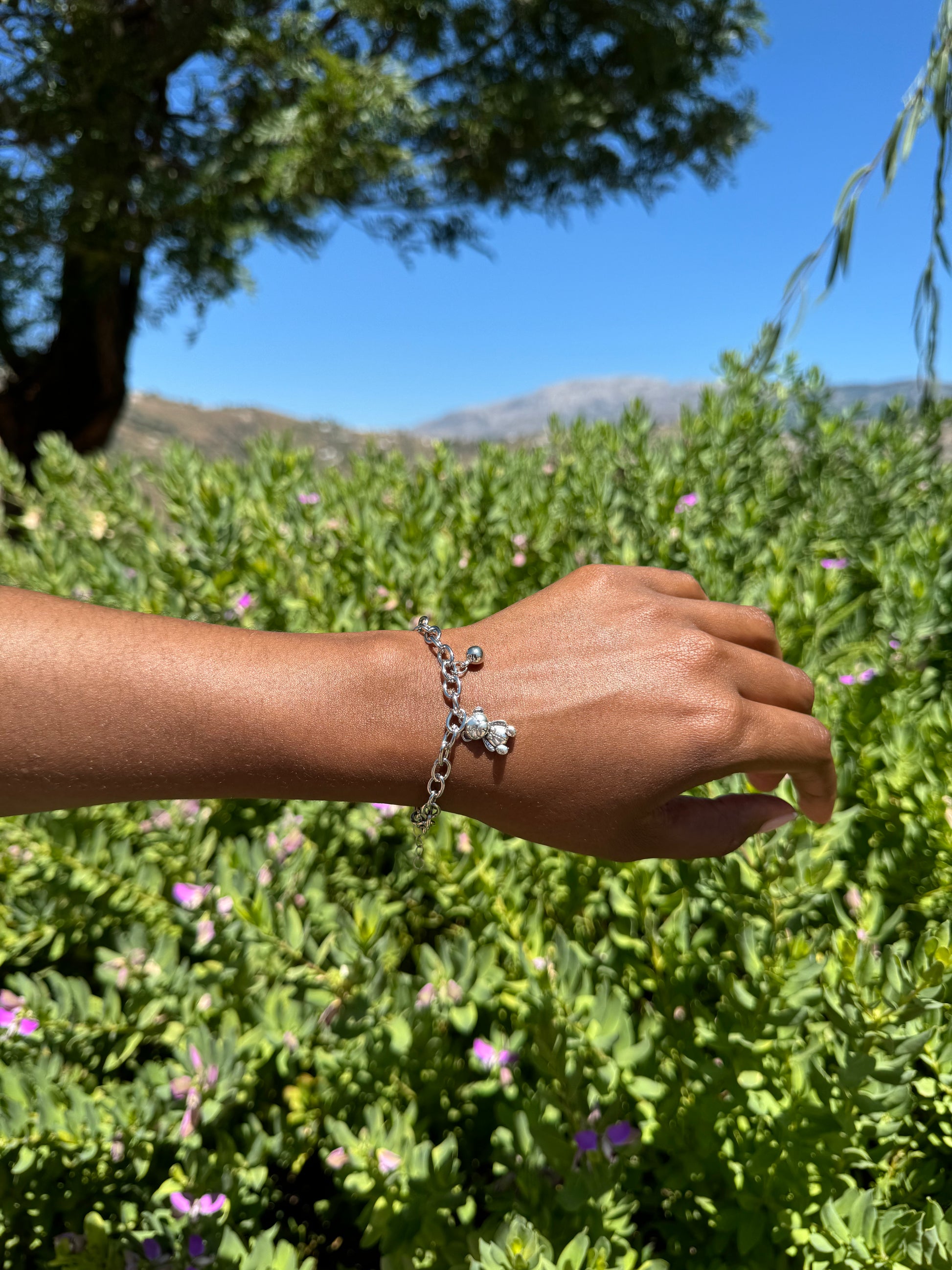 Bracelet ajustable à grosse maille, breloque oursons et perles.