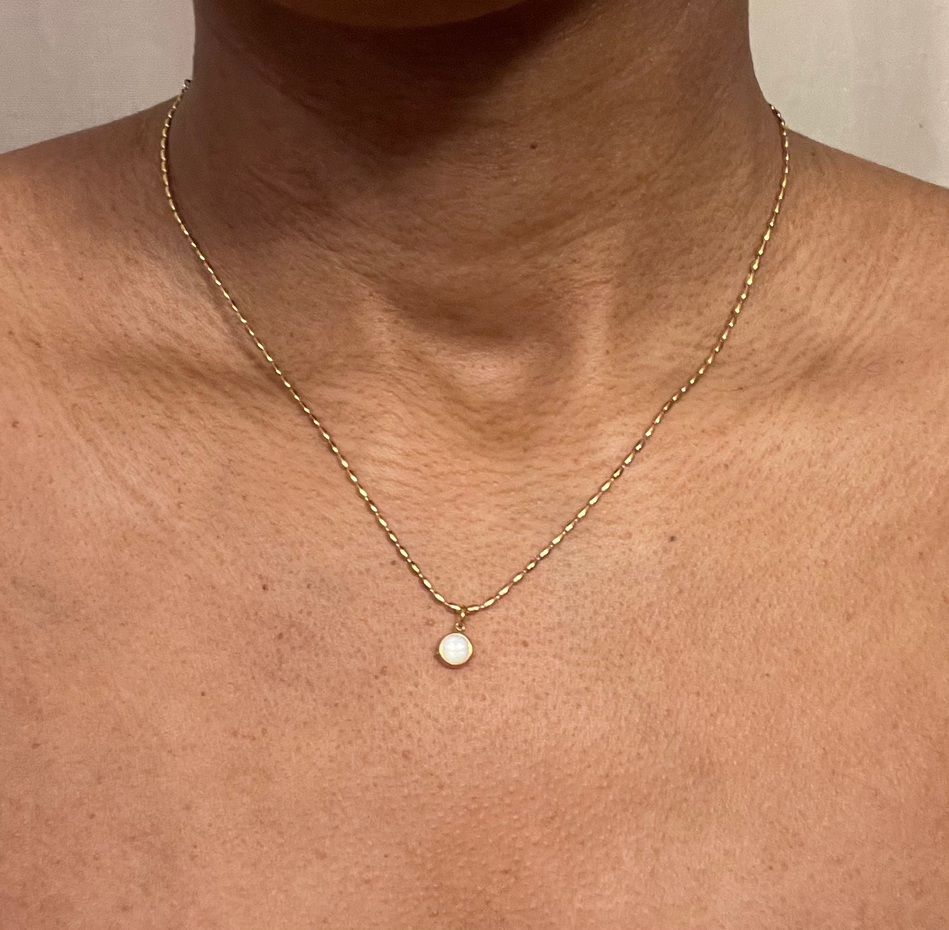 Élégant collier à maille fine en forme de haricot, avec un pendentif rond orné d'une petite pierre blanche.